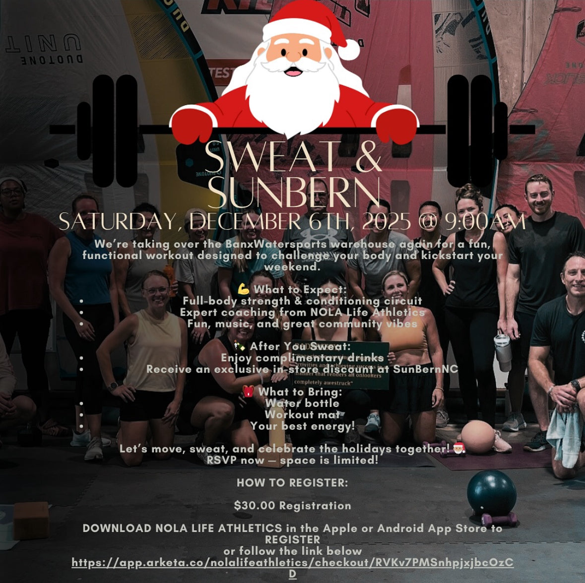 Join us on Saturday, December 6th at 9:00 next door at Banx Watersports for a full body workout. Nola Life Athletics will lead the sweat session, then we will gather at Sun Bern for sips and shopping with a special 20% off in store discount for participants.