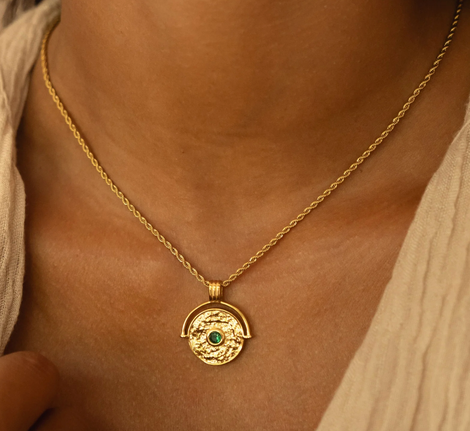 Wake up with intention and let Gaia move with you. From your morning espresso ritual to golden-hour walks through the city, this necklace feels like a natural extension of your energy. The polished golden coin paired with a vibrant green stone brings a subtle reminder of balance.