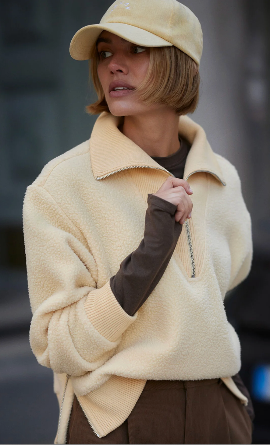 The Jaylin half-zip is crafted from a soft Plush Borg Fleece and cut to a relaxed fit - perfect for layering over your transitional looks or lounging in the winter months. The ribbed hem, cuffs, and the V-shaped rib panel around the collar add extra texture, while side zips at the hem set a subtle accent.